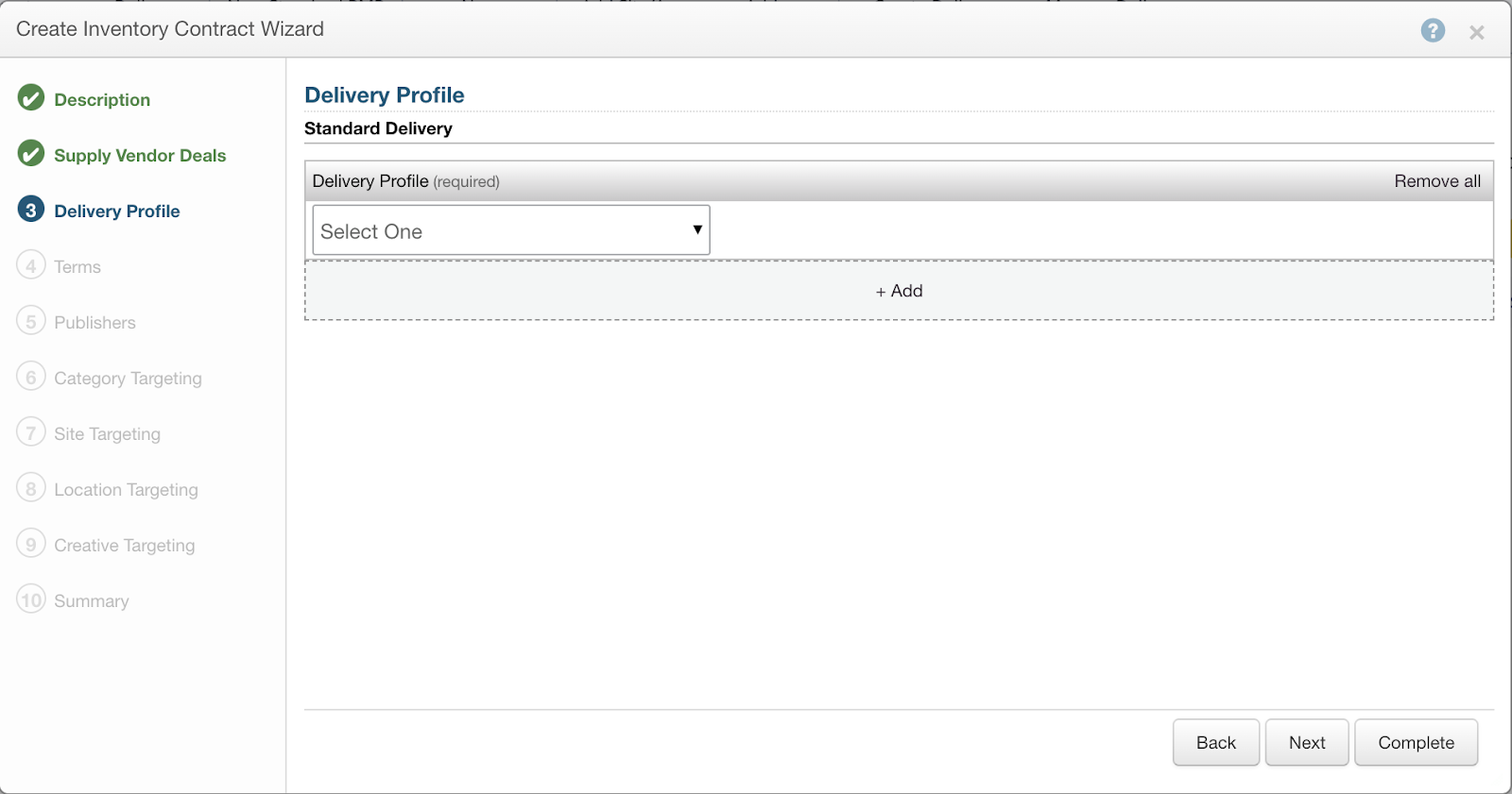 - Click “Select One” under “Delivery Profile” and associate your corresponding advertiser so the deal can be leveraged.