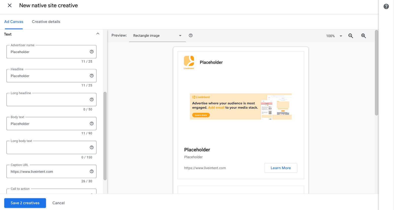 - Add Placeholder text for the “Advertiser Name”, “Headline”, “Body Text”, “Caption URL”, and “Call to Action”.